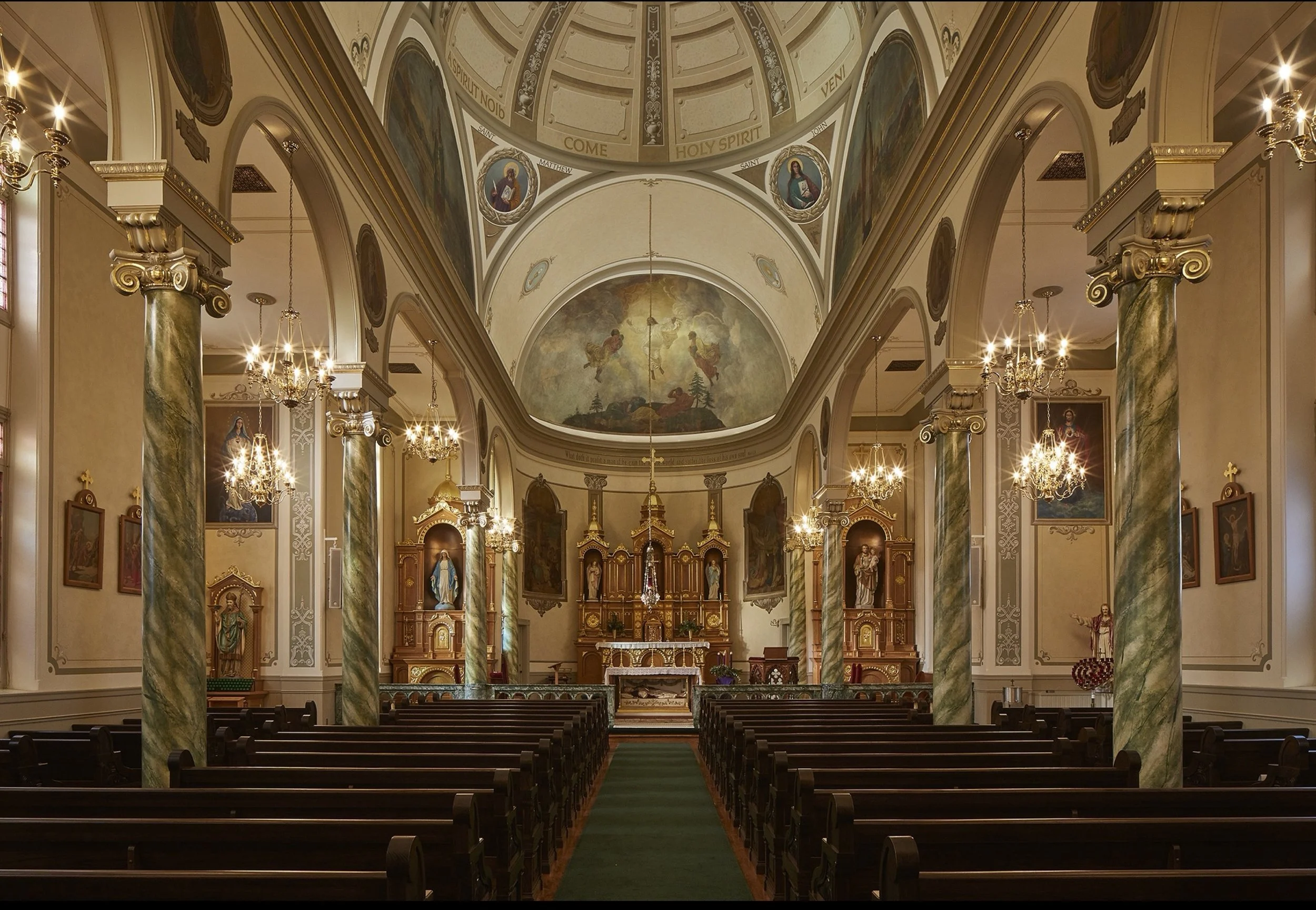 This cultural heritage project, led by HCG (Heritage Conservation Group), involved the conservation of historic paintings, the recreation of overpainted decorative painting schemes seen in historic documentation, and indoor and outdoor gilding. SLCAS provided assistance as a conservation technician and a project assistant working on the design and execution of decorative painting elements recreated from historic documentation, including the columns behind the altar, transept panels, barrel vault apse roundels, and, most extensively, the center dome.